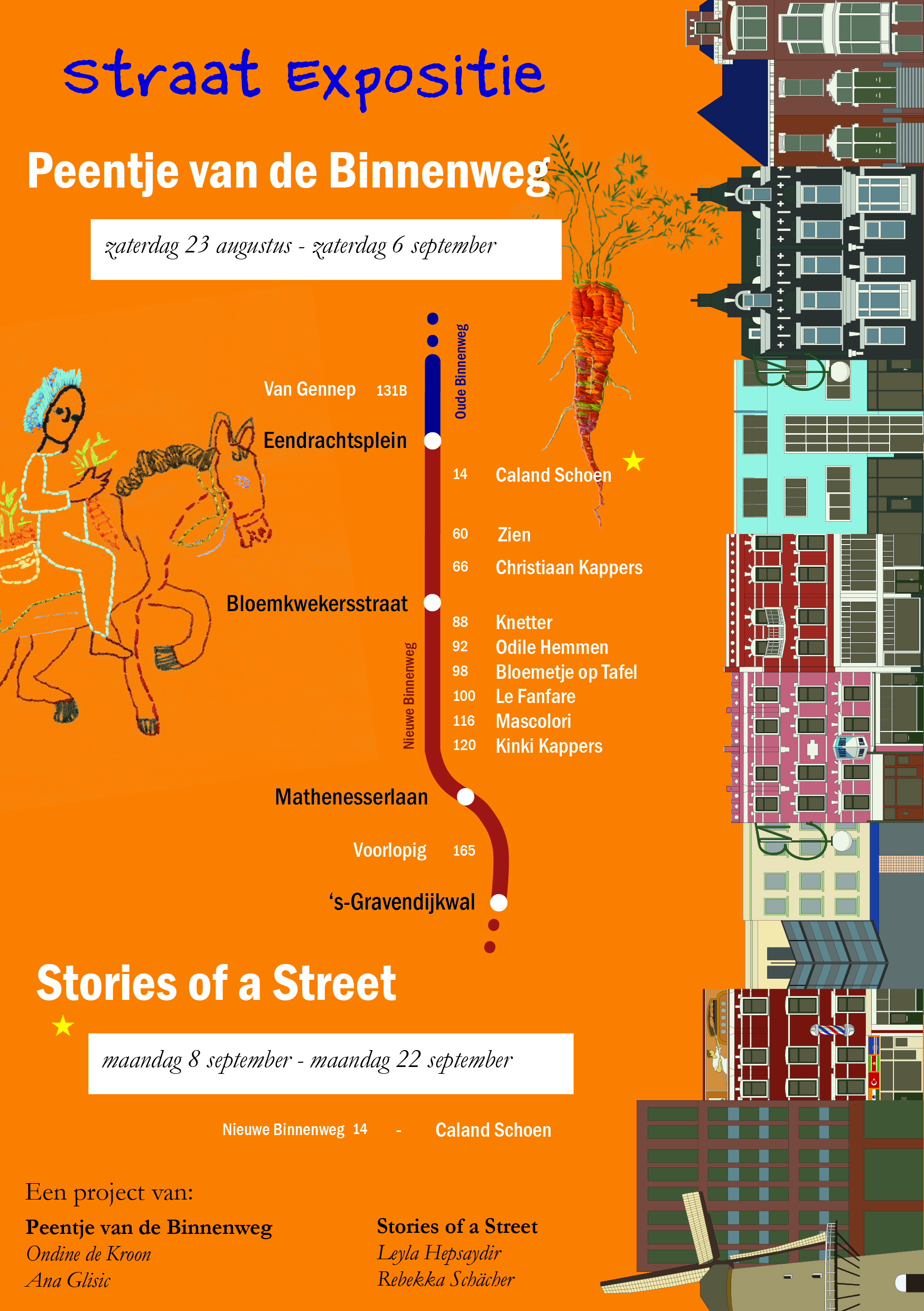 De laatste weken van augustus zijn de tafelkleden en knuffelpenen in de etalages van de Nieuwe Binnenweg te zien. De winkeliers hebben peentjes in hun geveltuintjes gezaaid die dan geoogst kunnen worden.